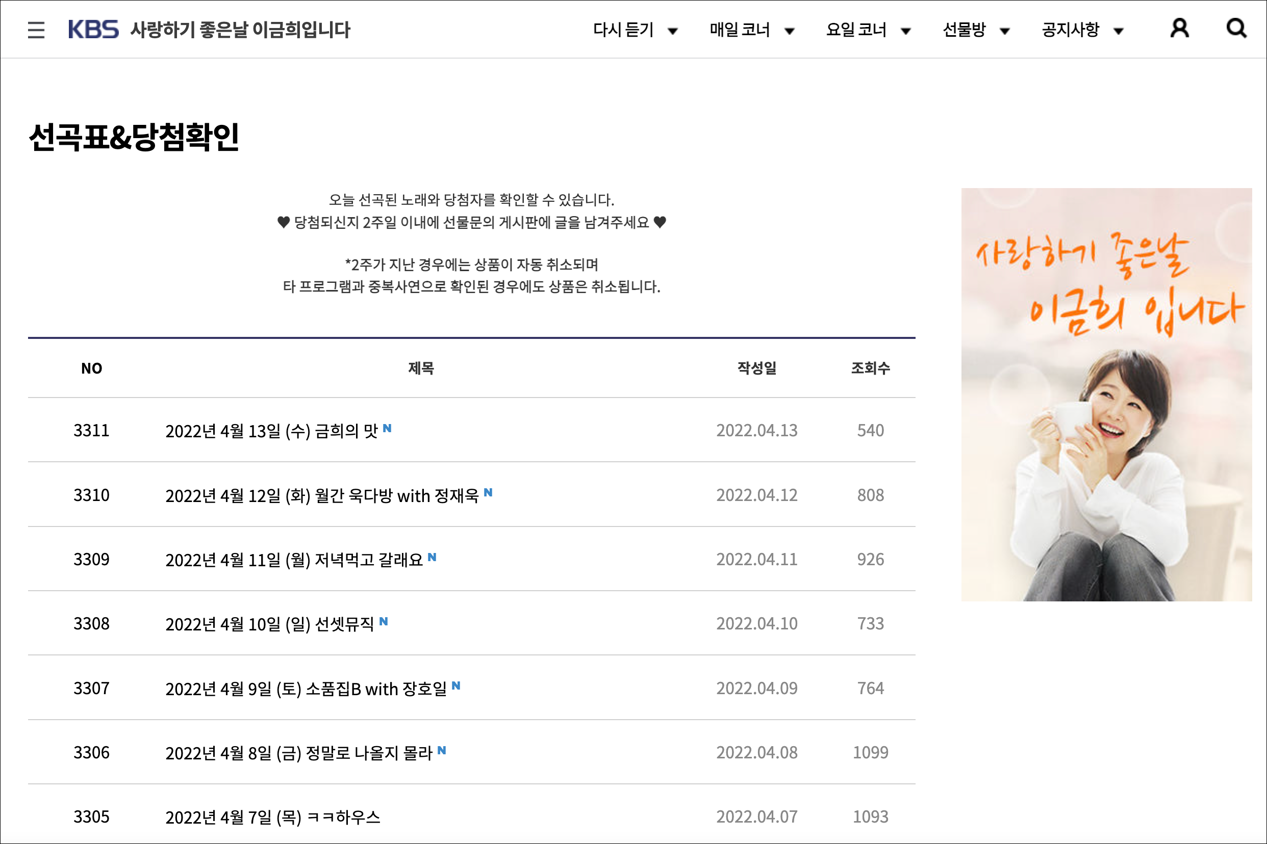간단 상식 사랑하기 좋은 날 이금희입니다 선곡표 확인하기 아주더운여름날 2022. 4. 14. 07:13 사랑하기 좋은날 이금희입니다 퇴근시간의 여유와 함께 하루를 리프레쉬하고 경쾌함을 준다. program.kbs.co.kr 공유하기 게시글 관리 열무김치밥 저작자표시 (새창열림) When you have faults, do not fear to abandon them. – Confucius '간단 상식' Related Articles 황매산 모산재 주차장에서 산행시간은? 목포에서 해남가는 버스 시간표는? 육아종합지원센터 e-러닝 홈페이지는? 75인치 벽걸이 tv 설치 높이는 얼마가 적당할까?