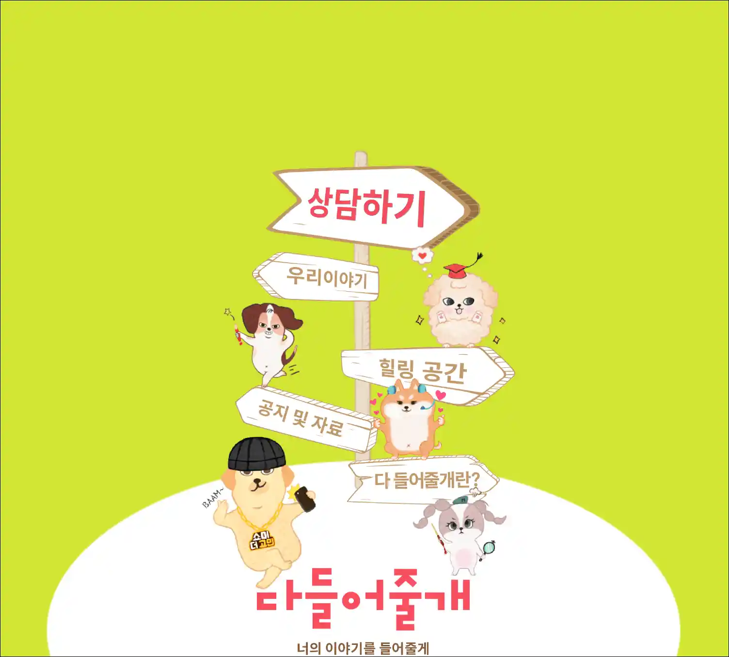 "다들어줄개"는 문자나 SNS를 통해 소통하는 것을 선호하는 청소년들의 생활 습관을 반영하여 만들어진 24시간 운영되는 전문 상담 서비스입니다. 이 시스템은 청소년들이 시간이나 장소에 구애받지 않고 다양한 문제를 상담할 수 있는 모바일 기반의 플랫폼을 제공합니다.