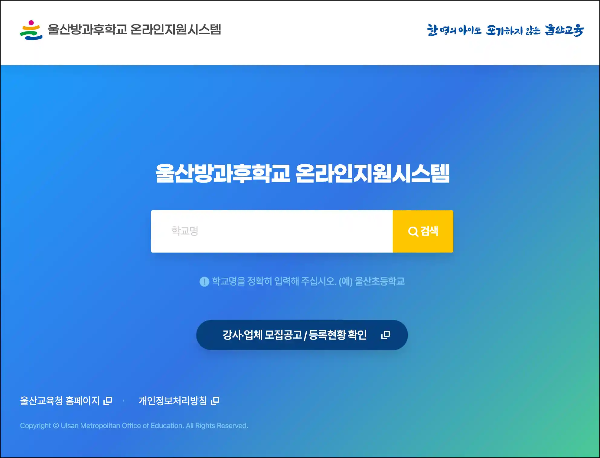 울산방과후학교 온라인지원시스템입니다. 이 시스템은 학생, 강사, 교직원이 로그인하여 방과 후 프로그램에 대한 정보를 확인하고, 각종 서비스를 이용할 수 있도록 지원합니다. 사이트 내에서는 학년, 반, 번호를 입력하여 로그인이 가능하며, 비밀번호 찾기와 시스템 안내 등의 기능을 모바일과 PC 환경에서 모두 제공합니다.