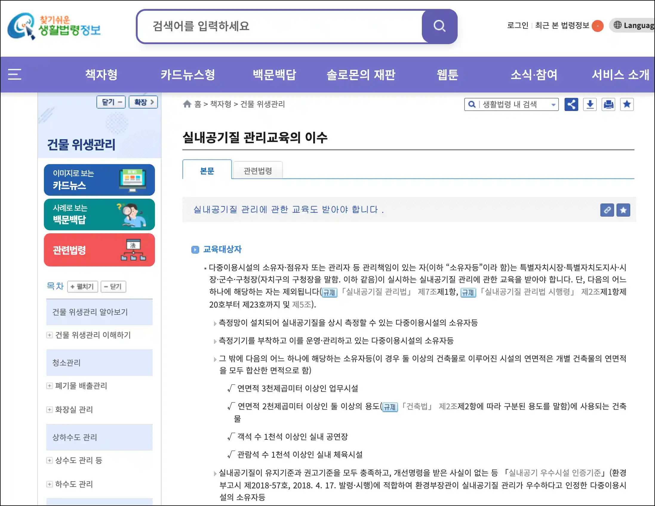 건물 위생관리 > 실내공기 관리 > 실내공기질 관리 등 > 실내공기질 관리교육의 이수 (본문) | 찾