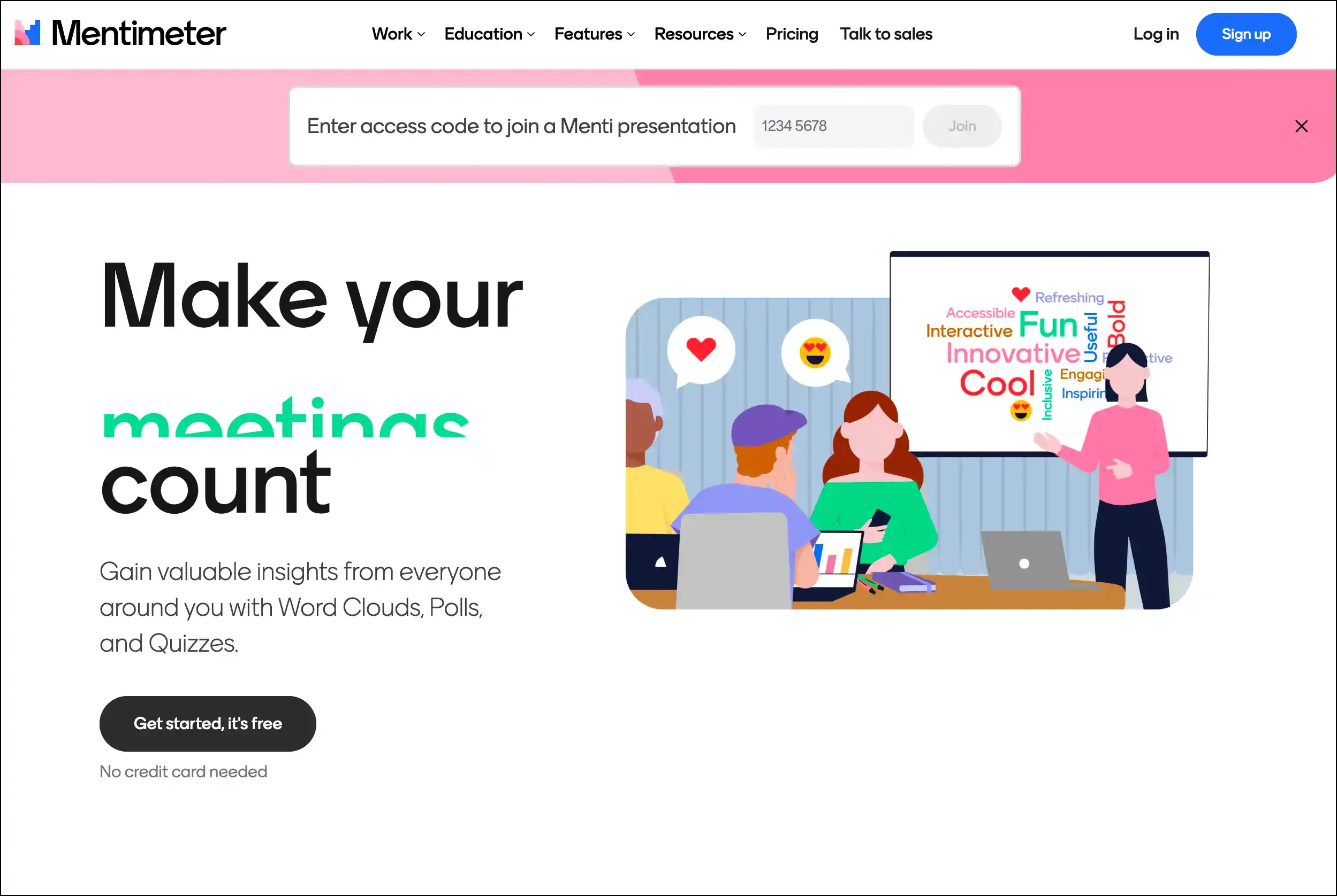Mentimeter는 인터랙티브 프레젠테이션을 제작할 수 있는 웹사이트로, 회의나 교육 등 다양한 상황에서 유용하게 사용됩니다. 사용자는 워드 클라우드, 투표, 퀴즈 등 다양한 인터랙티브 슬라이드를 통해 청중의 의견을 수집하고 피드백을 얻을 수 있습니다. 이를 통해 청중과의 즉각적인 상호작용을 가능하게 하며, 더 나은 결정을 내릴 수 있는 통찰력을 제공합니다. 주요 사용자는 교육자, 기업체, 이벤트 주최자 등이 있습니다.