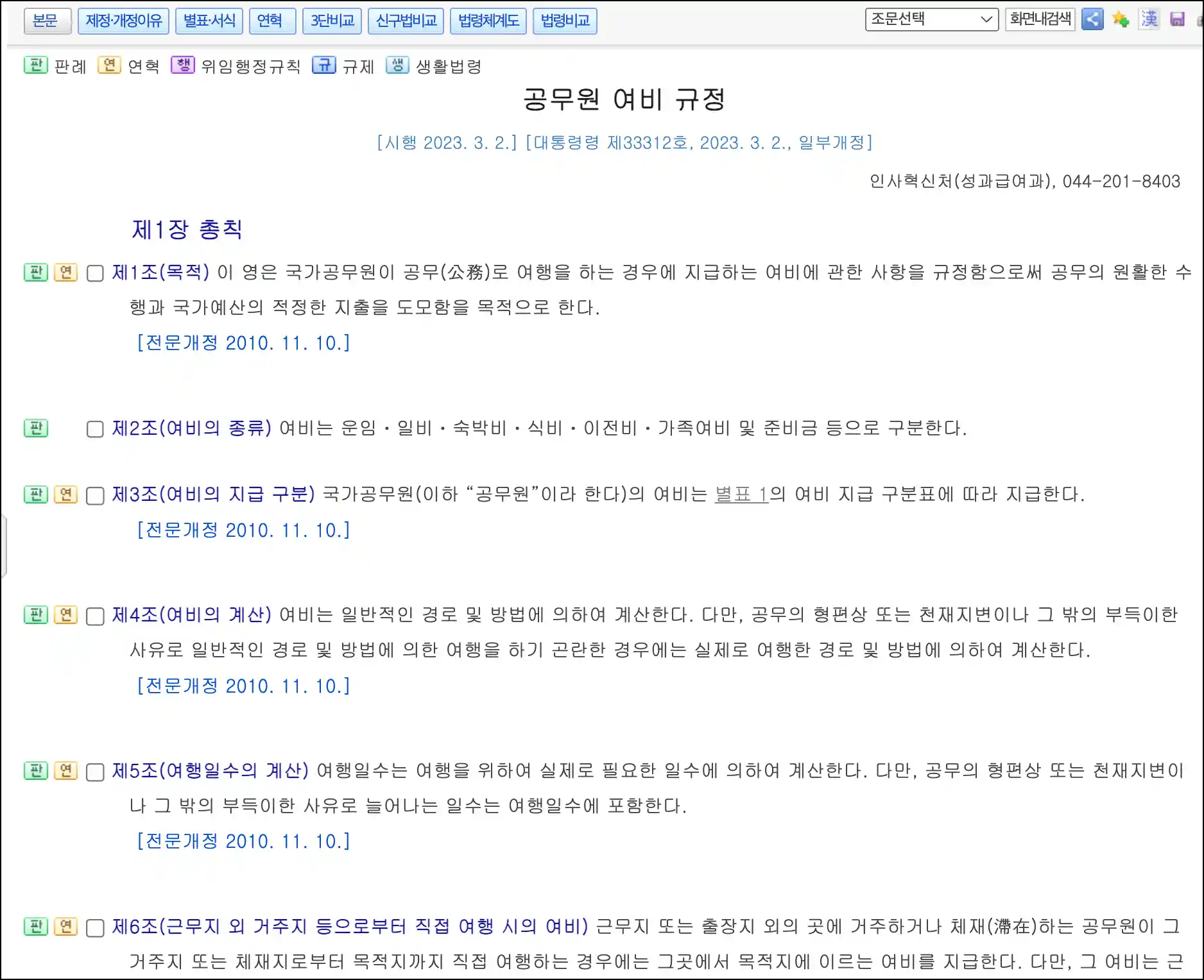 이 페이지는 공무원 여비 규정에 대한 정보를 제공하는 법제처의 공식 웹페이지입니다. 공무원 여비 규정은 공무원이 국내 및 해외 출장 시 발생하는 경비를 지급받는 기준과 절차를 규정한 법령입니다.