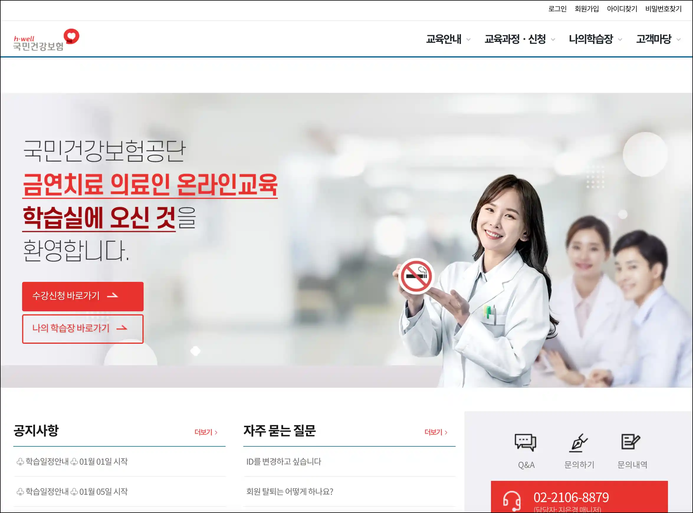 금연치료 온라인교육 사이트는 국민건강보험공단에서 제공하는 금연치료 교육 플랫폼입니다. 주로 금연치료에 관한 교육과정을 제공하며, 의료인을 대상으로 한 학습 자료와 지원 프로그램을 안내합니다. 사용자는 수강 신청, 학습 진행, 완료 과정을 관리할 수 있으며, 공지사항과 자주 묻는 질문을 통해 필요한 정보를 쉽게 얻을 수 있습니다.