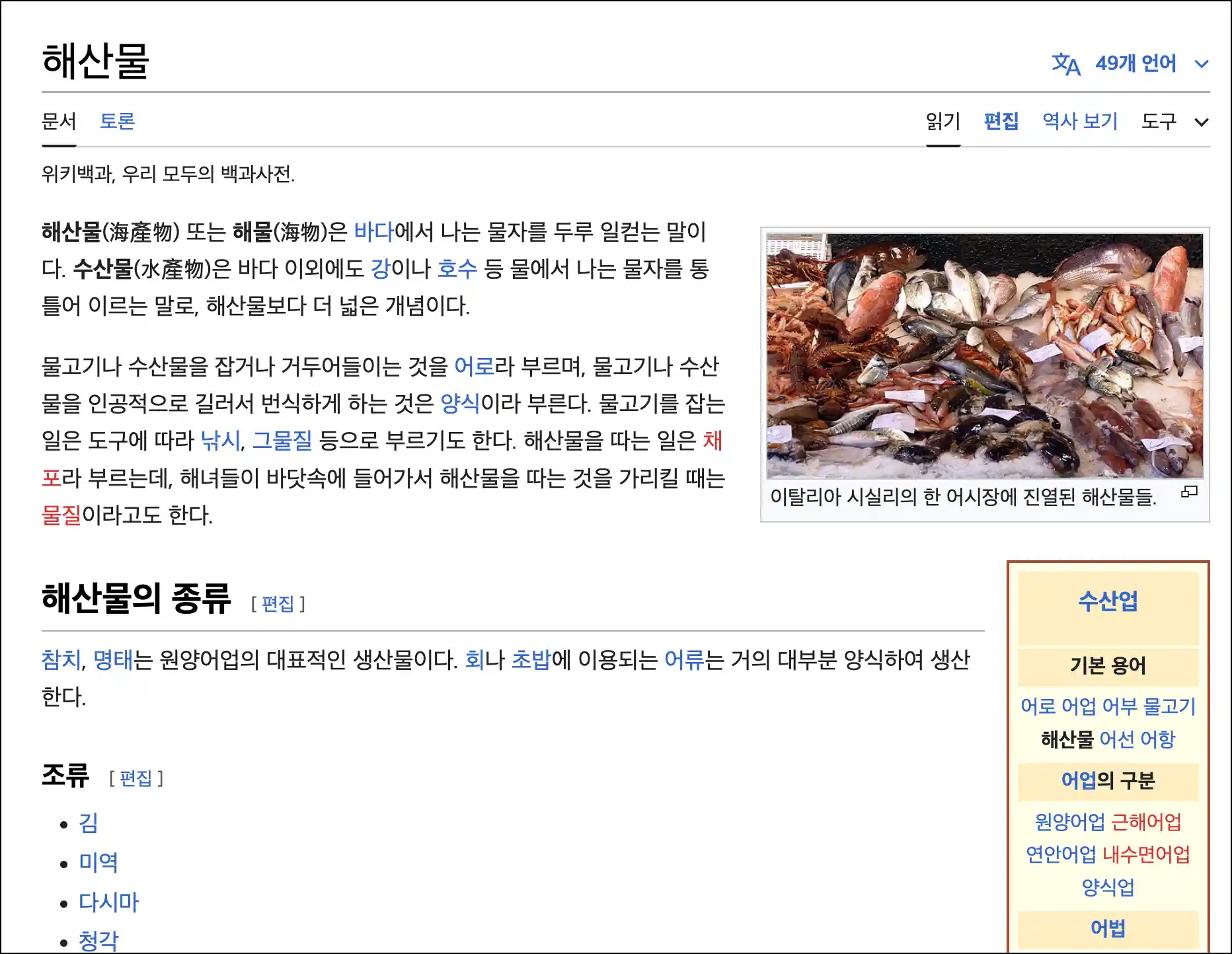 위키백과, 우리 모두의 백과사전. 이탈리아 시실리의 한 어시장에 진열된 해산물들. 해산물(海產物) 또는 해물(海物)은 바다에서 나는 물자를 두루 일컫는 말이다. 수산물(水產物)은 바다 이외에