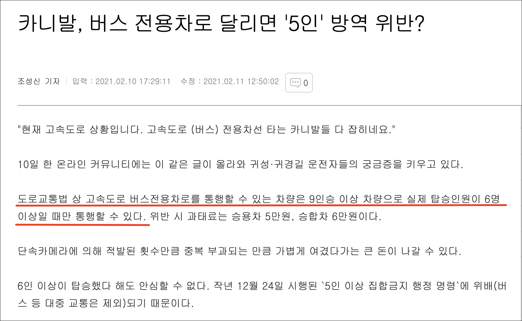 카니발, 버스 전용차로 달리면 `5인` 방역 위반?