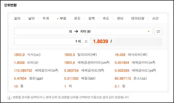 네이버나 다음 검색에서 1되라는 단위는 부피로 인식을 하고 있어요. 하지만 우리나라 사람들이라면 보통 그 네모박스를 의미하지 않을까요? 그래서 1되가 몇kg인지 자료를 좀 더 찾아보았습니다.