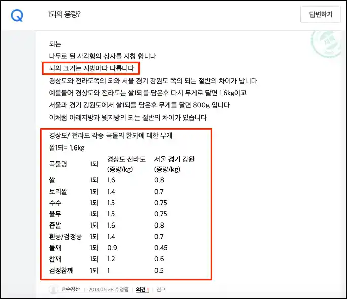 다음팁에서 정말로 도움이 되는 글을 찾았는데요, 경상도와 전라도에서 곡물을 재는 단위인데, 서로 다른거예요. 경상도나 전라도의 경우 1되는 1.6kg인데, 서울, 경기, 강원도 같은 경우는 그의 절반정도 이네요. 서로 다른 지역에서는 되 라는 단위를 사용하면 안되겠어요. 오해가 생길수도 있겠어요... 되는 어떻게 생긴 물건인지 알아볼께요.