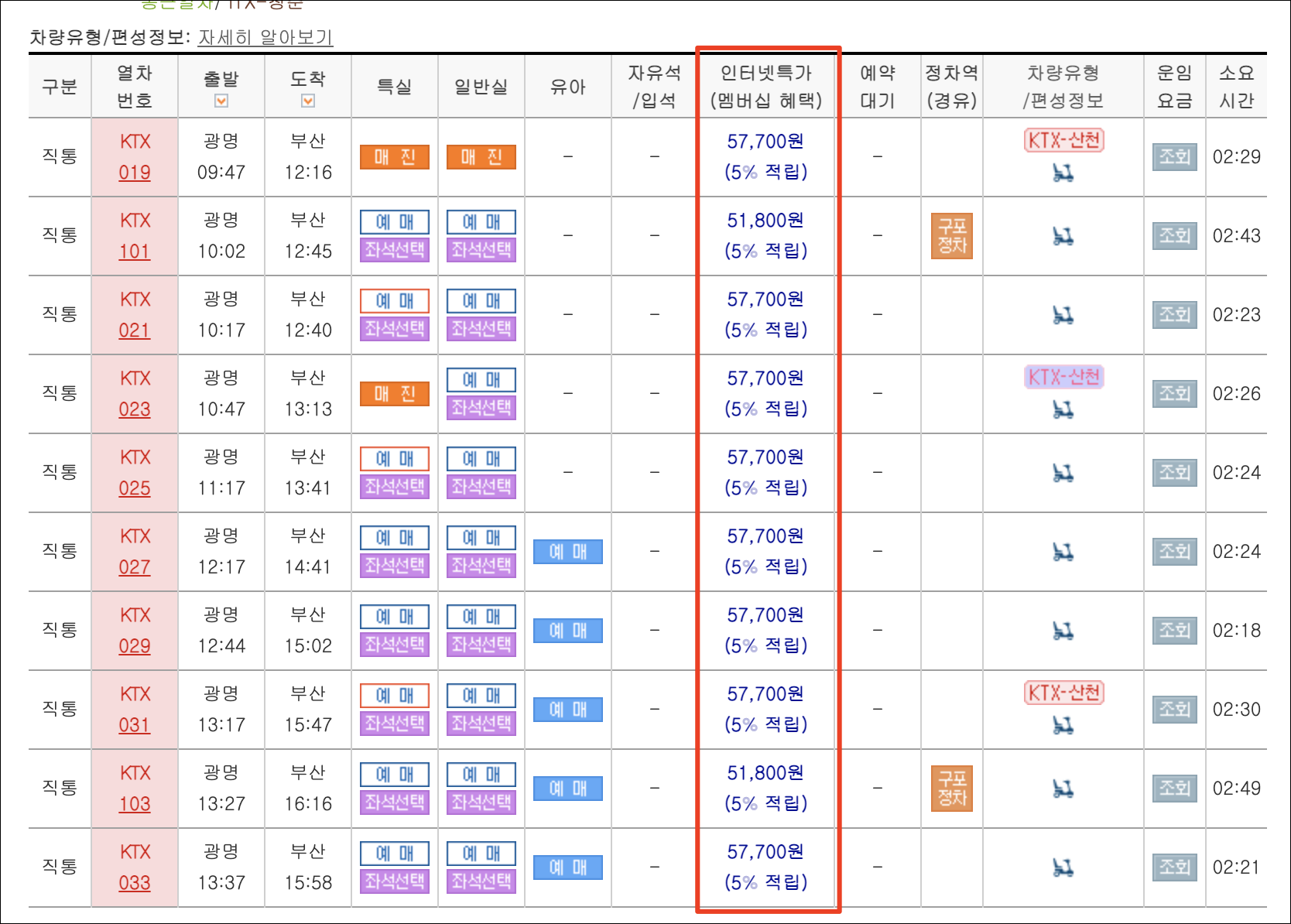 코레일 사이트에서 조회해보니, 광명에서 부산까지 ktx 요금은 57,700원 하네요.